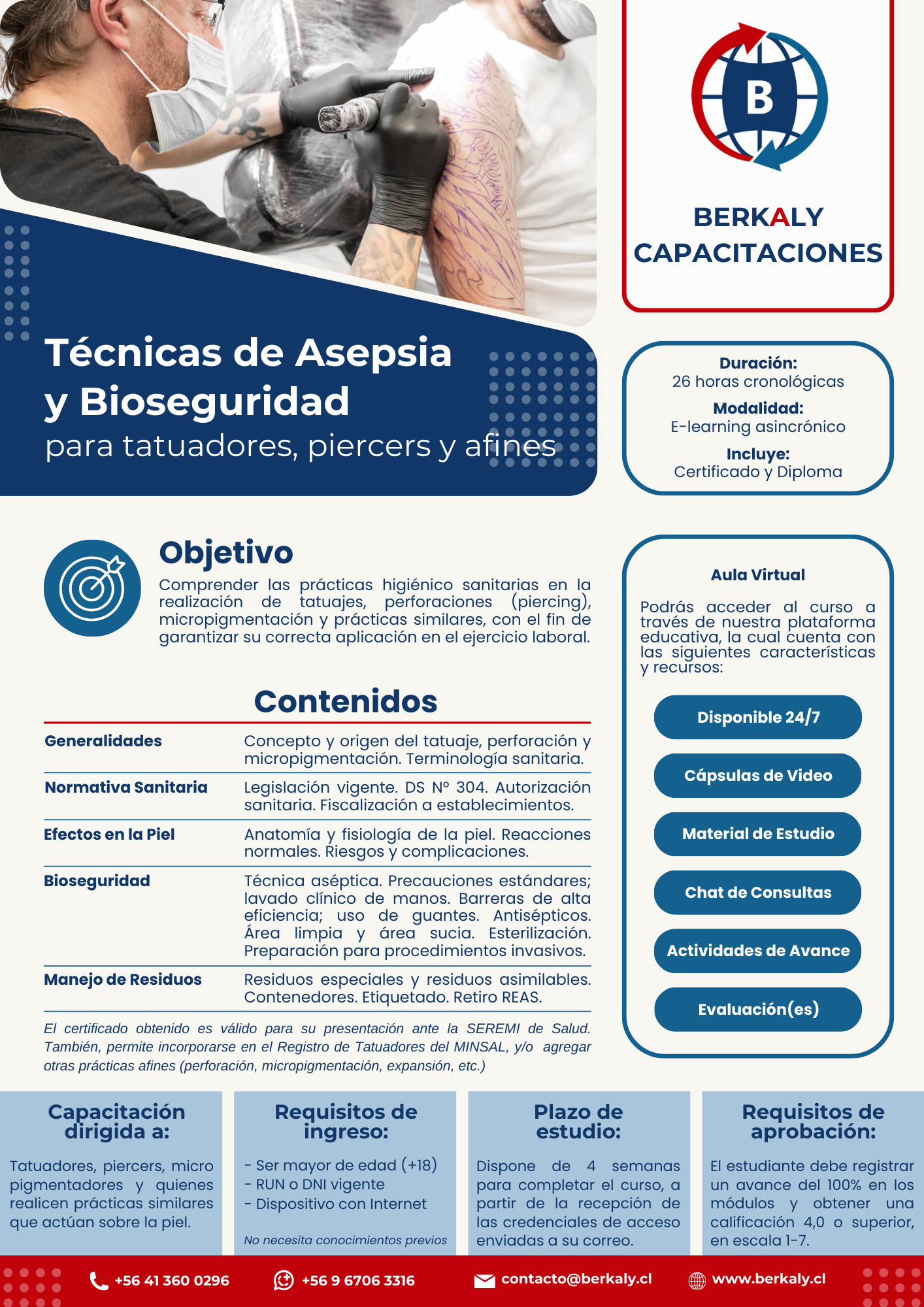 El objetivo del curso es identificar las prácticas higiénico sanitarias que contemplan la aplicacIón del tatuaje, perforación, micropigmentación y afines, fomentando la seguridad de los usuarios y de los operadores en el ejercicio laboral